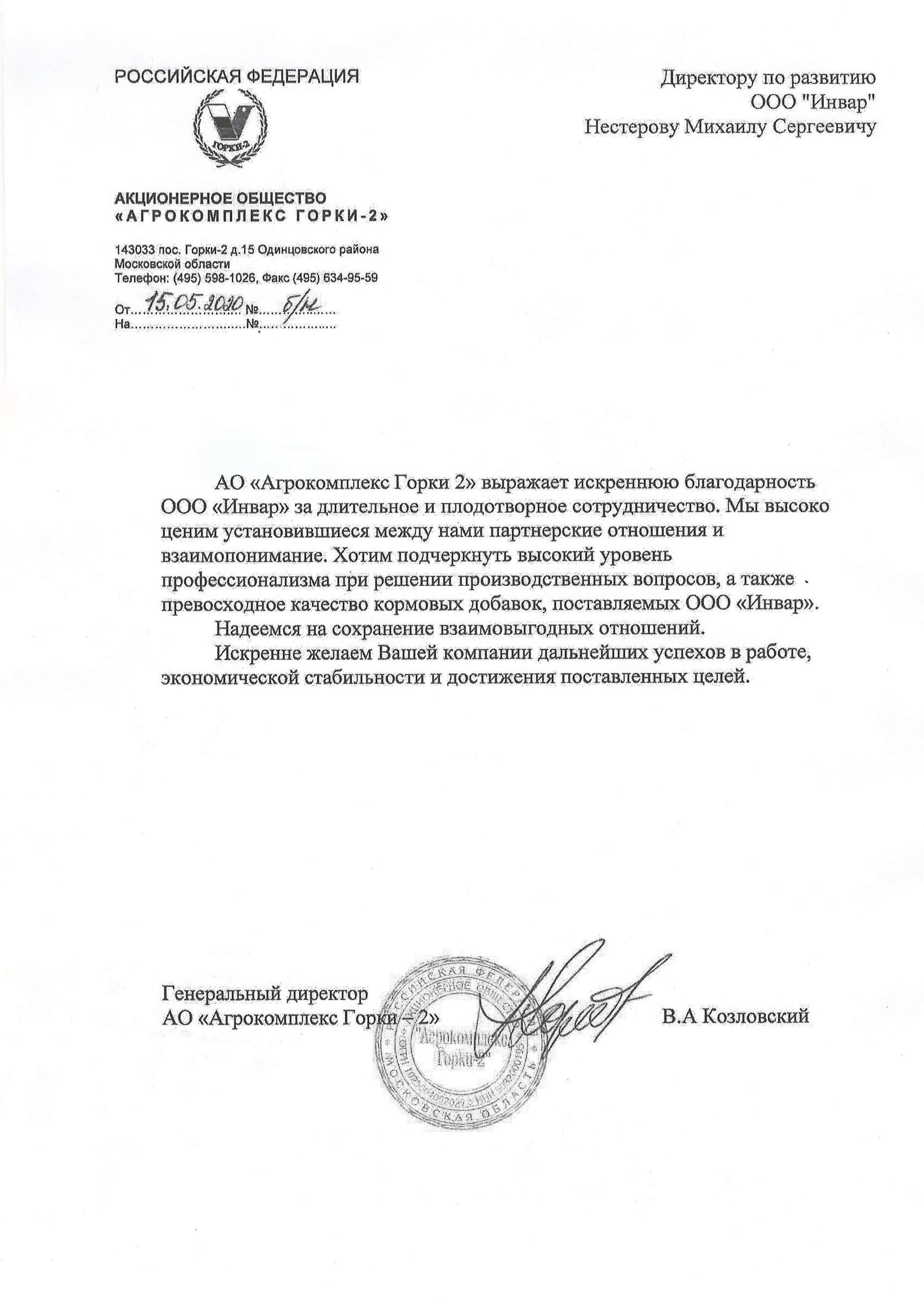 АО «Агрокомплекс Горки 2» выражает искреннюю благодарность ООО «Инвар» за длительное и плодотворное сотрудничество. Мы высоко ценим установившиеся между нами партнерские отношения и взаимопонимание. Хотим подчеркнуть высокий уровень профессионализма при решении производственных вопросов, а также превосходное качество кормовых добавок, поставляемых ООО «Инвар».